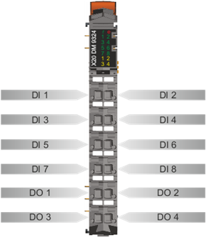 •该模块配备 8 个输入和 4 个输出,用于 1 线连接。 输入设计用于漏式连接,输出用于源式连接。